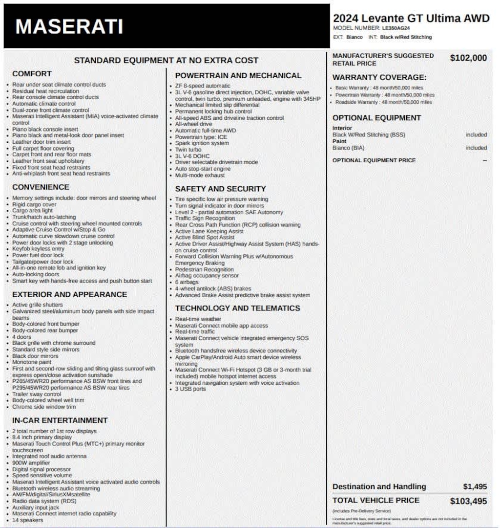 BIANCO, BLACK W/RED STITCHING, FULL PREMIUM PERFORATED LEATHER UPHOLSTERY, Proximity Key For Doors And Push Button Start, Sport Heated Leather Steering Wheel, Mobile Hotspot Internet Access, Power Rear Windows, Fixed 3Rd Row Windows And W/Power 2Nd Row Sun Blinds, Automatic Full-Time All-Wheel, 12-Way Heated & Ventilated Power Front Sport Seats -Inc: 2-Position Memory For Driver, harman/kardon® 900W Premium Audio System -Inc: 14 Speakers W/Subwoofer, Headlights-Automatic Highbeams, Led Brakelights, Perimeter/Approach Lights, Express Open/Close Sliding And Tilting Glass 1St And 2Nd Row Sunroof W/Power Sunshade, Back-Up Camera, Active Lane Keeping Assist Lane Departure Warning, Power Door Locks W/Autolock Feature, Remote Keyless Entry W/Integrated Key Transmitter And Illuminated Entry, Adaptive Cruise Control W/Stop & Go. Maserati GT Ultima with Bianco exterior and Black w/Red Stitching interior features a V6 Cylinder Engine with 345 HP at 5750 RPM*. CARFAX 1-Owner AutoCheck One Owner Reduced from $72,968. This Levante is priced $500 below Kelley Blue Book.