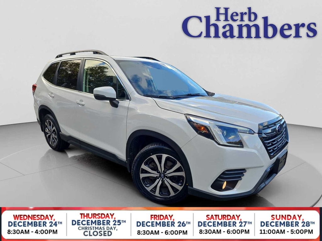 Leather Seats, Sunroof, Panoramic Roof, All Wheel Drive, Power Liftgate, Heated Driver Seat, Back-Up Camera, Aluminum Wheels, Keyless Start, Dual Zone A/C, Brake Actuated Limited Slip Differential, Blind Spot Monitor, Lane Keeping Assist, WiFi Hotspot, Heated Seats. Rear Spoiler, Remote Trunk Release, Keyless Entry, Privacy Glass, Child Safety Locks. Subaru Limited with Crystal White Pearl exterior and Black interior features a 4 Cylinder Engine with 182 HP at 5800 RPM*. CARFAX 1-Owner 5-Day 100% Money Back Guarantee / 30-Day 1,500 Mile Vehicle Exchange and, A complete Vehicle Portfolio & CarFax. Visit www.herbchamberssmartpricing.com for complete details. Only a Herb Chambers CERTIFIED Pre-Owned vehicle receives a rigorous Multi-Point Inspection Was $29,998. This Forester is priced $200 below Kelley Blue Book.